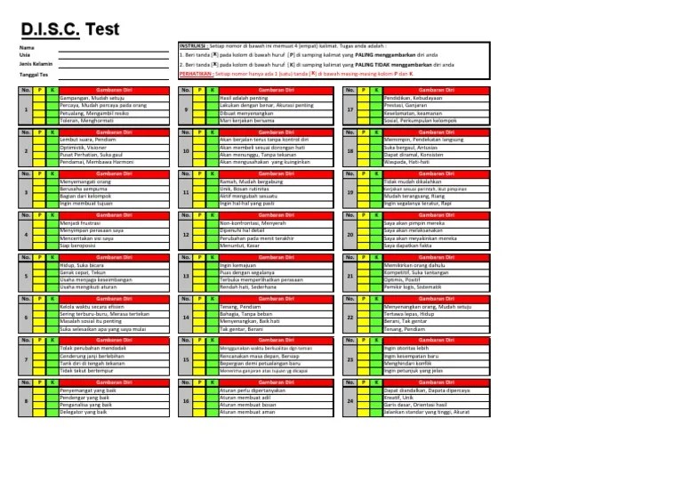 Lembar Tes Disc Pdf / 1 - Dua sumbu yang saling berlawanan pada tes disc ini digunakan yaitu antara assertiveness dan receptiveness dan antara openness dan control.. lembar latihan tes pauli dan kraepelin ukuran kertas Durasi waktu untuk pauli test biasanya sekitar 60 menit, dengan instruksi "garis" Tester memberikan instruksi tata cara pelaksanaan papi costick's test pada testee. Contoh soal tes tertulis bagian administrasi. Pelaksanaan tes tester membagikan 1 buku soal dan lembar jawaban pada testee.